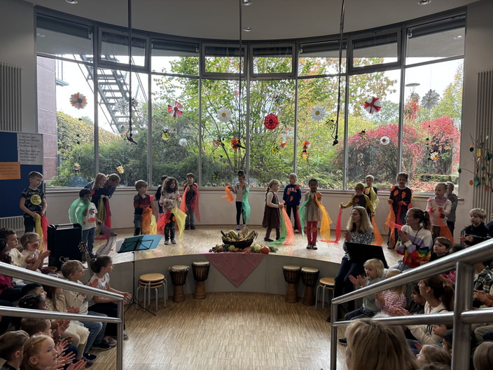 In diesem Jahr wurde das traditionelle Herbstfest wieder von den Klassen 1 und 4 gestaltet. Nach einem gemeinsamen Frühstück in den Klassen traf sich die ganze Schulgemeinde im Forum. Gemeinsam sorgten die Kinder für ein buntes, fröhliches und abwechslungsreiches Programm, das das ganze Forum erfüllte. Zwischen den Beiträgen sangen alle gemeinsam stimmungsvolle Herbstlieder und feierten so den goldenen Jahreszeitenwechsel. Die Freude und Begeisterung der Kinder war überall spürbar – ein echtes Highlight im Schulleben!