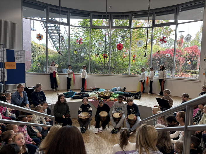 In diesem Jahr wurde das traditionelle Herbstfest wieder von den Klassen 1 und 4 gestaltet. Nach einem gemeinsamen Frühstück in den Klassen traf sich die ganze Schulgemeinde im Forum. Gemeinsam sorgten die Kinder für ein buntes, fröhliches und abwechslungsreiches Programm, das das ganze Forum erfüllte. Zwischen den Beiträgen sangen alle gemeinsam stimmungsvolle Herbstlieder und feierten so den goldenen Jahreszeitenwechsel. Die Freude und Begeisterung der Kinder war überall spürbar – ein echtes Highlight im Schulleben!