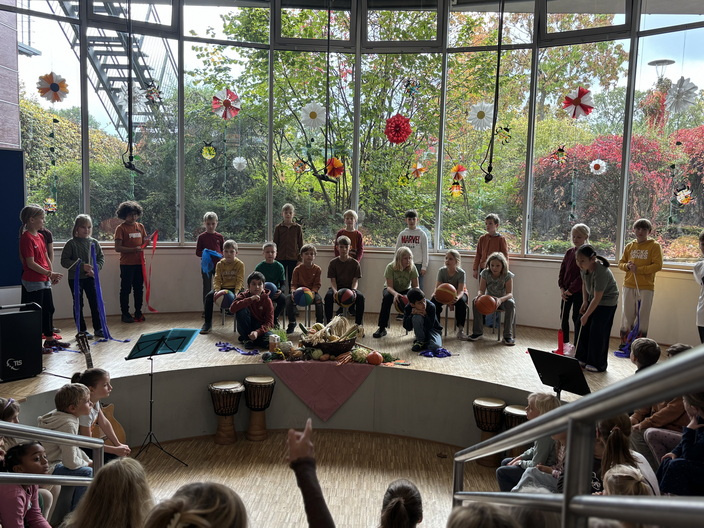 In diesem Jahr wurde das traditionelle Herbstfest wieder von den Klassen 1 und 4 gestaltet. Nach einem gemeinsamen Frühstück in den Klassen traf sich die ganze Schulgemeinde im Forum. Gemeinsam sorgten die Kinder für ein buntes, fröhliches und abwechslungsreiches Programm, das das ganze Forum erfüllte. Zwischen den Beiträgen sangen alle gemeinsam stimmungsvolle Herbstlieder und feierten so den goldenen Jahreszeitenwechsel. Die Freude und Begeisterung der Kinder war überall spürbar – ein echtes Highlight im Schulleben!