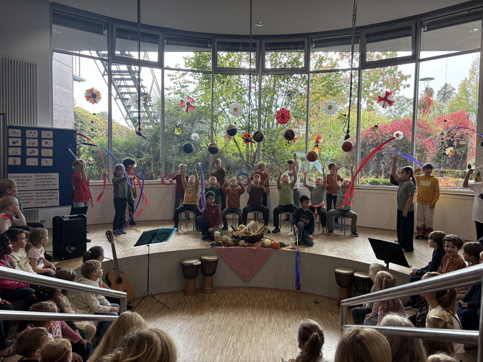 In diesem Jahr wurde das traditionelle Herbstfest wieder von den Klassen 1 und 4 gestaltet. Nach einem gemeinsamen Frühstück in den Klassen traf sich die ganze Schulgemeinde im Forum. Gemeinsam sorgten die Kinder für ein buntes, fröhliches und abwechslungsreiches Programm, das das ganze Forum erfüllte. Zwischen den Beiträgen sangen alle gemeinsam stimmungsvolle Herbstlieder und feierten so den goldenen Jahreszeitenwechsel. Die Freude und Begeisterung der Kinder war überall spürbar – ein echtes Highlight im Schulleben!