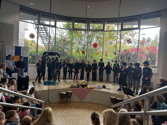 In diesem Jahr wurde das traditionelle Herbstfest wieder von den Klassen 1 und 4 gestaltet. Nach einem gemeinsamen Frühstück in den Klassen traf sich die ganze Schulgemeinde im Forum. Gemeinsam sorgten die Kinder für ein buntes, fröhliches und abwechslungsreiches Programm, das das ganze Forum erfüllte. Zwischen den Beiträgen sangen alle gemeinsam stimmungsvolle Herbstlieder und feierten so den goldenen Jahreszeitenwechsel. Die Freude und Begeisterung der Kinder war überall spürbar – ein echtes Highlight im Schulleben!