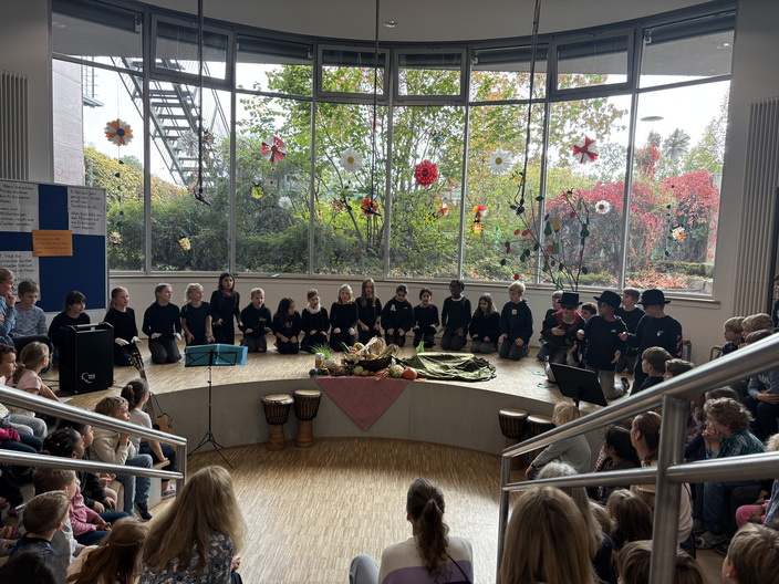 In diesem Jahr wurde das traditionelle Herbstfest wieder von den Klassen 1 und 4 gestaltet. Nach einem gemeinsamen Frühstück in den Klassen traf sich die ganze Schulgemeinde im Forum. Gemeinsam sorgten die Kinder für ein buntes, fröhliches und abwechslungsreiches Programm, das das ganze Forum erfüllte. Zwischen den Beiträgen sangen alle gemeinsam stimmungsvolle Herbstlieder und feierten so den goldenen Jahreszeitenwechsel. Die Freude und Begeisterung der Kinder war überall spürbar – ein echtes Highlight im Schulleben!