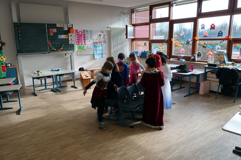 Das Feiern war beschränkt auf die eigene Klasse. Die Foto-Galerie zeigt aber, dass die Kinder das Feiern trotzdem sehr genossen haben. Und daruf ein dreifaches „Mosaik-Schule – Helau!“