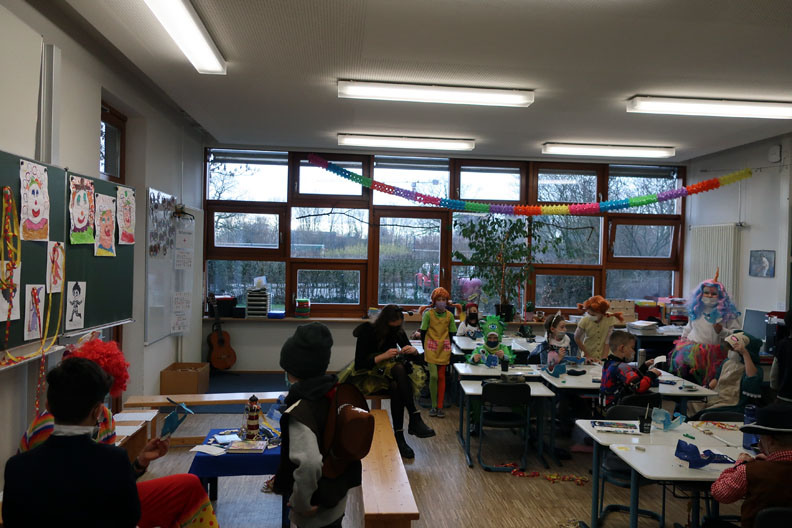 Das Feiern war beschränkt auf die eigene Klasse. Die Foto-Galerie zeigt aber, dass die Kinder das Feiern trotzdem sehr genossen haben. Und daruf ein dreifaches „Mosaik-Schule – Helau!“