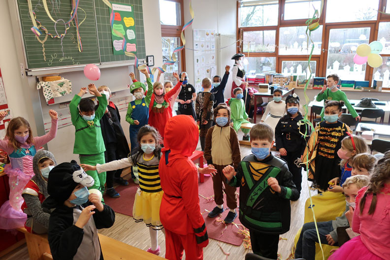 Das Feiern war beschränkt auf die eigene Klasse. Die Foto-Galerie zeigt aber, dass die Kinder das Feiern trotzdem sehr genossen haben. Und daruf ein dreifaches „Mosaik-Schule – Helau!“