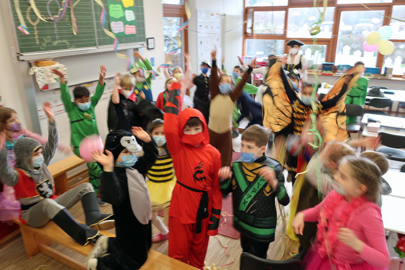 Das Feiern war beschränkt auf die eigene Klasse. Die Foto-Galerie zeigt aber, dass die Kinder das Feiern trotzdem sehr genossen haben. Und daruf ein dreifaches „Mosaik-Schule – Helau!“