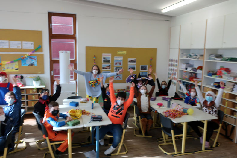 Das Feiern war beschränkt auf die eigene Klasse. Die Foto-Galerie zeigt aber, dass die Kinder das Feiern trotzdem sehr genossen haben. Und daruf ein dreifaches „Mosaik-Schule – Helau!“