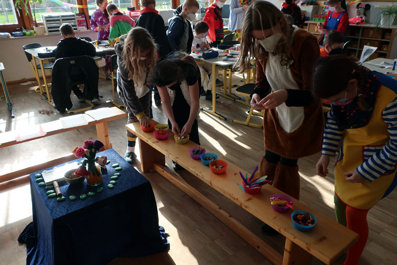 Das Feiern war beschränkt auf die eigene Klasse. Die Foto-Galerie zeigt aber, dass die Kinder das Feiern trotzdem sehr genossen haben. Und daruf ein dreifaches „Mosaik-Schule – Helau!“