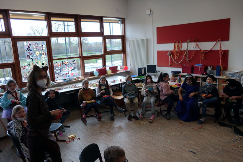 Das Feiern war beschränkt auf die eigene Klasse. Die Foto-Galerie zeigt aber, dass die Kinder das Feiern trotzdem sehr genossen haben. Und daruf ein dreifaches „Mosaik-Schule – Helau!“