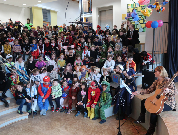 Um 8:15 Uhr öffneten einige Eltern die Türen für die Kinder, da die Lehrkräfte bereits im Forum versteckt hinter dem Vorhang auf die Kinder warteten. Daher waren alle Kinder auch schnell im Forum und die Eltern verteilten die mitgebrachten ,gesunden‘ Leckerein auf den Tischen im Flur. Den fleißigen HelferInnen und für das leckere Buffet ein großes Dankeschön.