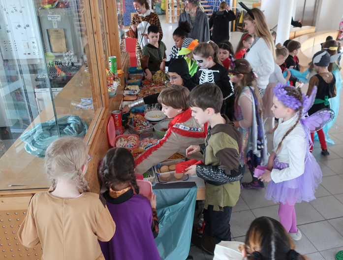 Um 8:15 Uhr öffneten einige Eltern die Türen für die Kinder, da die Lehrkräfte bereits im Forum versteckt hinter dem Vorhang auf die Kinder warteten. Daher waren alle Kinder auch schnell im Forum und die Eltern verteilten die mitgebrachten ,gesunden‘ Leckerein auf den Tischen im Flur. Den fleißigen HelferInnen und für das leckere Buffet ein großes Dankeschön.