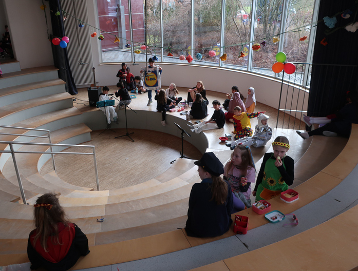 Um 8:15 Uhr öffneten einige Eltern die Türen für die Kinder, da die Lehrkräfte bereits im Forum versteckt hinter dem Vorhang auf die Kinder warteten. Daher waren alle Kinder auch schnell im Forum und die Eltern verteilten die mitgebrachten ,gesunden‘ Leckerein auf den Tischen im Flur. Den fleißigen HelferInnen und für das leckere Buffet ein großes Dankeschön.