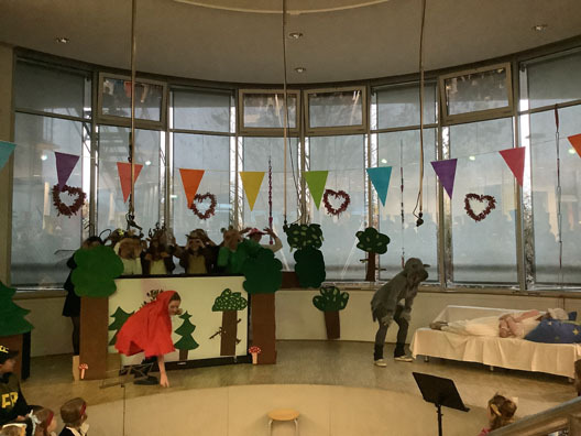 In diesem Jahr startete der Karneval in der Mosaik-Schule bereits am Donnerstag mit dem Besuch der KG Soffie Gievenbeck. Im Forum begrüßten die Kinder das Prinzenpaar und die Tanzgruppe, die die Stimmung im Forum schon hochkochen ließ.