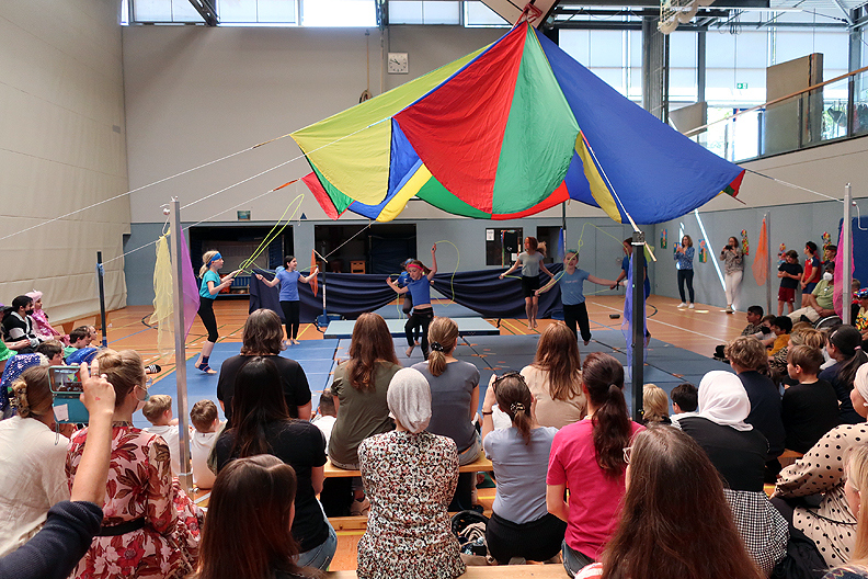 Leider mussten wir dieses Jahr wegen Corona im März unseren Schulzirkus absagen und auf den April 2023 verschieben. Damit unsere Viertklässler aber auch Zirkus-Luft schnuppern dürfen, haben die Lehrerinnen des 4. Jahrgangs zusammen mit Mitarbeiterinnen von „Musifratz“ ab dem 30.05.22 eine Projektwoche organisiert. Jeden Tag probten die Kinder in verschiedenen Kleingruppen. Am Freitag, den 03.06.22, konnten die Kinder dann ihr Können als Clowns, Jongleure, Akrobaten, Raubtiere, Tänzer, Pantominen, Schauspieler und Kampfkünstler bei einer Zirkusvorstellung in der Turnhalle vor den Eltern aufführen. Und der Applaus zeigte, dass das mehr als nur eine Ersatz-Zirkus-Vorstellung war. Danke allen Beteiligten für den tollen Einsatz!