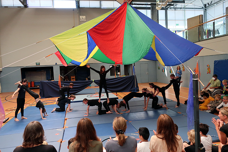 Leider mussten wir dieses Jahr wegen Corona im März unseren Schulzirkus absagen und auf den April 2023 verschieben. Damit unsere Viertklässler aber auch Zirkus-Luft schnuppern dürfen, haben die Lehrerinnen des 4. Jahrgangs zusammen mit Mitarbeiterinnen von „Musifratz“ ab dem 30.05.22 eine Projektwoche organisiert. Jeden Tag probten die Kinder in verschiedenen Kleingruppen. Am Freitag, den 03.06.22, konnten die Kinder dann ihr Können als Clowns, Jongleure, Akrobaten, Raubtiere, Tänzer, Pantominen, Schauspieler und Kampfkünstler bei einer Zirkusvorstellung in der Turnhalle vor den Eltern aufführen. Und der Applaus zeigte, dass das mehr als nur eine Ersatz-Zirkus-Vorstellung war. Danke allen Beteiligten für den tollen Einsatz!