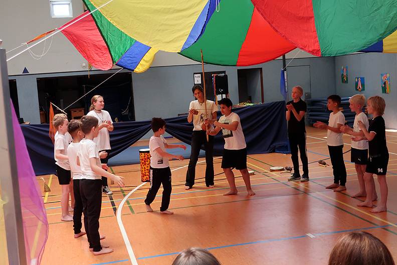 Leider mussten wir dieses Jahr wegen Corona im März unseren Schulzirkus absagen und auf den April 2023 verschieben. Damit unsere Viertklässler aber auch Zirkus-Luft schnuppern dürfen, haben die Lehrerinnen des 4. Jahrgangs zusammen mit Mitarbeiterinnen von „Musifratz“ ab dem 30.05.22 eine Projektwoche organisiert. Jeden Tag probten die Kinder in verschiedenen Kleingruppen. Am Freitag, den 03.06.22, konnten die Kinder dann ihr Können als Clowns, Jongleure, Akrobaten, Raubtiere, Tänzer, Pantominen, Schauspieler und Kampfkünstler bei einer Zirkusvorstellung in der Turnhalle vor den Eltern aufführen. Und der Applaus zeigte, dass das mehr als nur eine Ersatz-Zirkus-Vorstellung war. Danke allen Beteiligten für den tollen Einsatz!