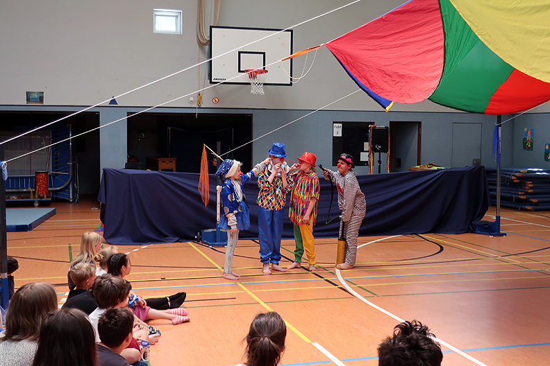 Leider mussten wir dieses Jahr wegen Corona im März unseren Schulzirkus absagen und auf den April 2023 verschieben. Damit unsere Viertklässler aber auch Zirkus-Luft schnuppern dürfen, haben die Lehrerinnen des 4. Jahrgangs zusammen mit Mitarbeiterinnen von „Musifratz“ ab dem 30.05.22 eine Projektwoche organisiert. Jeden Tag probten die Kinder in verschiedenen Kleingruppen. Am Freitag, den 03.06.22, konnten die Kinder dann ihr Können als Clowns, Jongleure, Akrobaten, Raubtiere, Tänzer, Pantominen, Schauspieler und Kampfkünstler bei einer Zirkusvorstellung in der Turnhalle vor den Eltern aufführen. Und der Applaus zeigte, dass das mehr als nur eine Ersatz-Zirkus-Vorstellung war. Danke allen Beteiligten für den tollen Einsatz!