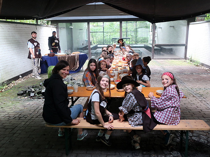 Vom 16. bis 18.08.23 fuhren die Viertklässler nach Haltern in die Bildungsstätte „Gilwell – Sankt Ludger“. Rahmenthema der Klassenfahrt war die Astrid Lindgren Geschichte „Ronja Räubertochter“. Zum Glück regnete es zum Start nur bei der Abfahrt in Münster. In Haltern hatten wir die ganzen Tage gutes Wetter und natürlich eine tolle Stimmung.