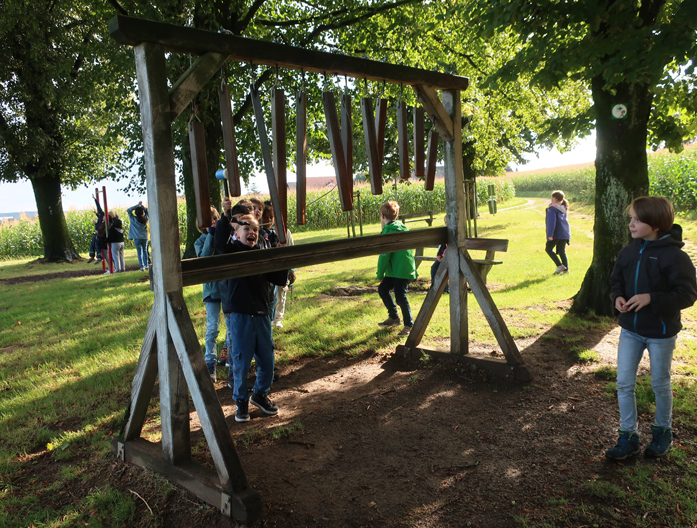Nach dem Mittagessen ging es dann zum Aussichtsturm am Mergelberg, ganz schön hoch mit seinen 168 Stufen. Schön war dann der Rückweg durch den Wald mit interessanten Wald-Lehr-Stationen und einem ersten Vorgucker auf den Niedrigseilgarten.