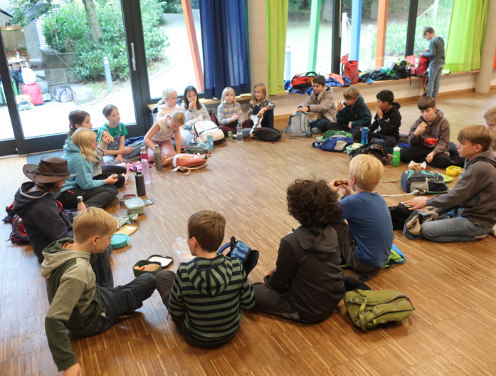 Die Klassenfahrt stand unter dem Motto „Ronja Räubertochter“. Dazu fanden ganz verschiedenen Aktionen statt, ruhigere wie Blindführen im Wald, kreative wie das Bauen von Behausungen für die Rumpelwichte, laute wie der Schreiwettlauf, lebendige wie das Spielen und Bewegen im Wald, aber auch sehr schmackhafte wie das Räubermahl und immer mal wieder kooperative Aufgaben, die nur die ganze Räuberbande zusammen lösen konnte.