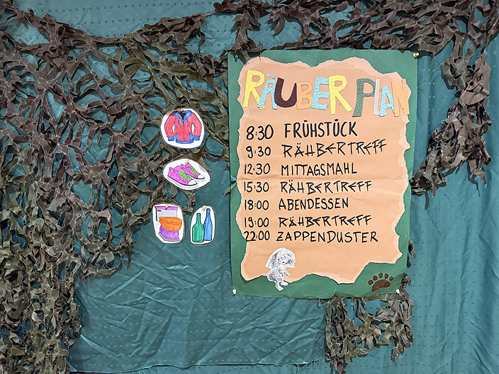 Die Klassenfahrt stand unter dem Motto „Ronja Räubertochter“. Dazu fanden ganz verschiedenen Aktionen statt, ruhigere wie Blindführen im Wald, kreative wie das Bauen von Behausungen für die Rumpelwichte, laute wie der Schreiwettlauf, lebendige wie das Spielen und Bewegen im Wald, aber auch sehr schmackhafte wie das Räubermahl und immer mal wieder kooperative Aufgaben, die nur die ganze Räuberbande zusammen lösen konnte.