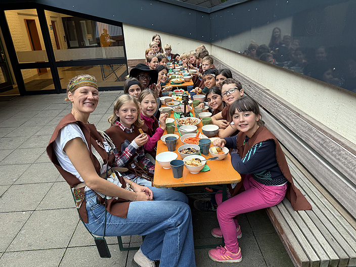 Die Klassenfahrt stand unter dem Motto „Ronja Räubertochter“. Dazu fanden ganz verschiedenen Aktionen statt, ruhigere wie Blindführen im Wald, kreative wie das Bauen von Behausungen für die Rumpelwichte, laute wie der Schreiwettlauf, lebendige wie das Spielen und Bewegen im Wald, aber auch sehr schmackhafte wie das Räubermahl und immer mal wieder kooperative Aufgaben, die nur die ganze Räuberbande zusammen lösen konnte.