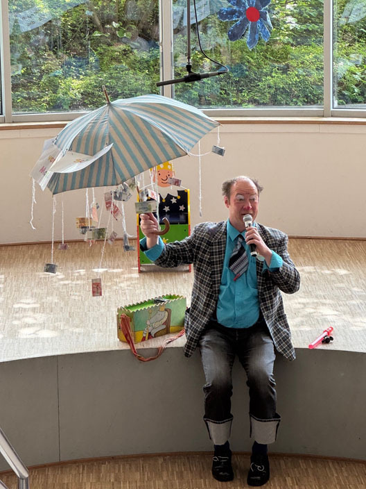 Klinikclown Harry Hempel – 2026 Veröffentlicht 25. April 2026 · Aktualisiert 25. April 2026 Im heutigen Freitagsforum durften wir einen ganz besonderen Gast begrüßen: Clown Harry Hempel von den Klinikclowns war bei uns zu Besuch. Klinikclown_2026_05 Bild 4 von 5 ließ für das Lesekind bunte Seifenblasen steigen und zauberte Frau Süs sogar eine rote Nase hinter dem Ohr hervor.