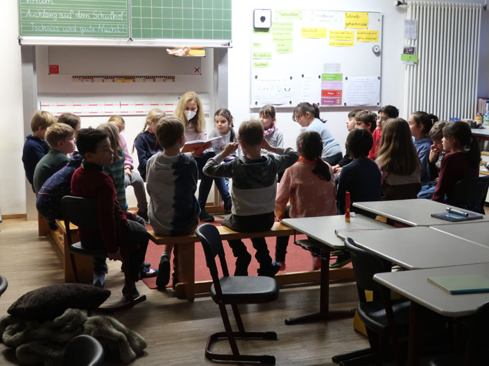 Kinder brachten Kissen, Kuscheltiere, Lese-Lampen und natürlich ein eigenes Buch mit. Zuerst gabe es eine Lese-Zeit oder Vorlese-Zeit in den Klassen. Als erstes kamen dann die Klassen 1 und 2 ins Forum. Dort wurden unsere Lese-Woche-Lieder gesungen wie „Lesen heißt auf Wolken liegen“. Zudem gab es auch ein eingesprochenes Vorlesebuch zum Hören und Sehen. Danach kamen die Kinder Klassen 3 und 4 ins Forum. Nach der Forumszeit gab es noch ein nettes Zusammensein in den Klassen mit den Eltern.