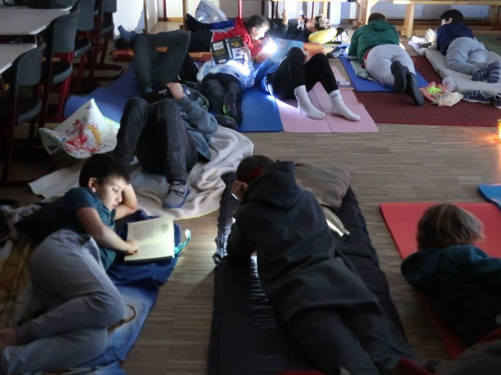 Kinder brachten Kissen, Kuscheltiere, Lese-Lampen und natürlich ein eigenes Buch mit. Zuerst gabe es eine Lese-Zeit oder Vorlese-Zeit in den Klassen. Als erstes kamen dann die Klassen 1 und 2 ins Forum. Dort wurden unsere Lese-Woche-Lieder gesungen wie „Lesen heißt auf Wolken liegen“. Zudem gab es auch ein eingesprochenes Vorlesebuch zum Hören und Sehen. Danach kamen die Kinder Klassen 3 und 4 ins Forum. Nach der Forumszeit gab es noch ein nettes Zusammensein in den Klassen mit den Eltern.