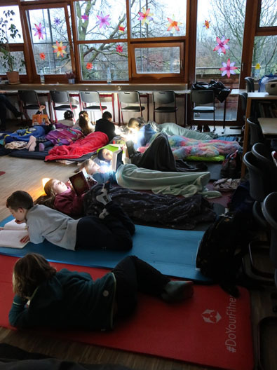 Kinder brachten Kissen, Kuscheltiere, Lese-Lampen und natürlich ein eigenes Buch mit. Zuerst gabe es eine Lese-Zeit oder Vorlese-Zeit in den Klassen. Als erstes kamen dann die Klassen 1 und 2 ins Forum. Dort wurden unsere Lese-Woche-Lieder gesungen wie „Lesen heißt auf Wolken liegen“. Zudem gab es auch ein eingesprochenes Vorlesebuch zum Hören und Sehen. Danach kamen die Kinder Klassen 3 und 4 ins Forum. Nach der Forumszeit gab es noch ein nettes Zusammensein in den Klassen mit den Eltern.