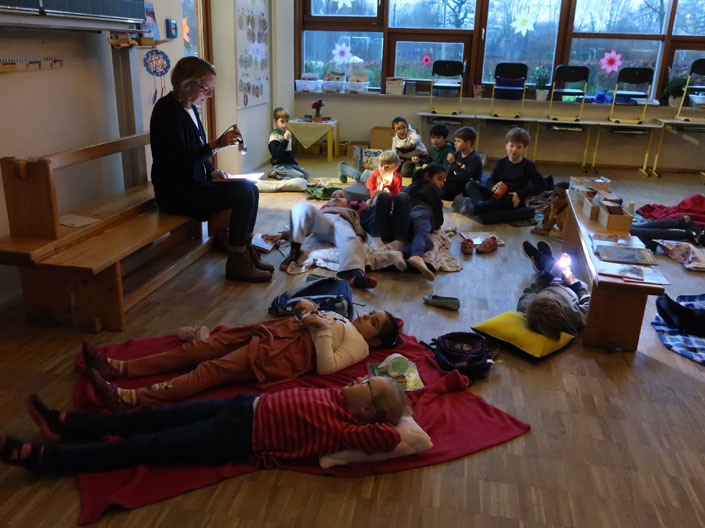 Kinder brachten Kissen, Kuscheltiere, Lese-Lampen und natürlich ein eigenes Buch mit. Zuerst gabe es eine Lese-Zeit oder Vorlese-Zeit in den Klassen. Als erstes kamen dann die Klassen 1 und 2 ins Forum. Dort wurden unsere Lese-Woche-Lieder gesungen wie „Lesen heißt auf Wolken liegen“. Zudem gab es auch ein eingesprochenes Vorlesebuch zum Hören und Sehen. Danach kamen die Kinder Klassen 3 und 4 ins Forum. Nach der Forumszeit gab es noch ein nettes Zusammensein in den Klassen mit den Eltern.