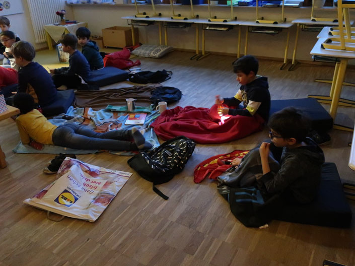 Kinder brachten Kissen, Kuscheltiere, Lese-Lampen und natürlich ein eigenes Buch mit. Zuerst gabe es eine Lese-Zeit oder Vorlese-Zeit in den Klassen. Als erstes kamen dann die Klassen 1 und 2 ins Forum. Dort wurden unsere Lese-Woche-Lieder gesungen wie „Lesen heißt auf Wolken liegen“. Zudem gab es auch ein eingesprochenes Vorlesebuch zum Hören und Sehen. Danach kamen die Kinder Klassen 3 und 4 ins Forum. Nach der Forumszeit gab es noch ein nettes Zusammensein in den Klassen mit den Eltern.