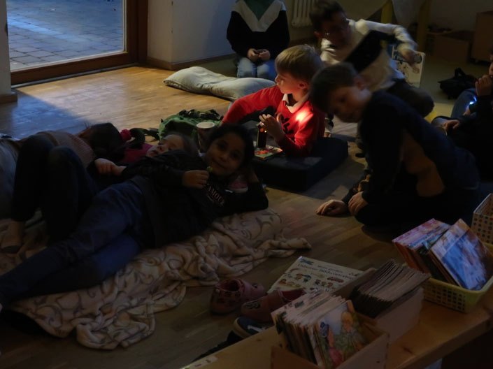 Kinder brachten Kissen, Kuscheltiere, Lese-Lampen und natürlich ein eigenes Buch mit. Zuerst gabe es eine Lese-Zeit oder Vorlese-Zeit in den Klassen. Als erstes kamen dann die Klassen 1 und 2 ins Forum. Dort wurden unsere Lese-Woche-Lieder gesungen wie „Lesen heißt auf Wolken liegen“. Zudem gab es auch ein eingesprochenes Vorlesebuch zum Hören und Sehen. Danach kamen die Kinder Klassen 3 und 4 ins Forum. Nach der Forumszeit gab es noch ein nettes Zusammensein in den Klassen mit den Eltern.