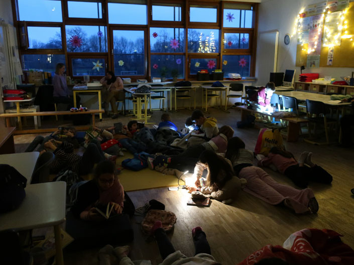 Kinder brachten Kissen, Kuscheltiere, Lese-Lampen und natürlich ein eigenes Buch mit. Zuerst gabe es eine Lese-Zeit oder Vorlese-Zeit in den Klassen. Als erstes kamen dann die Klassen 1 und 2 ins Forum. Dort wurden unsere Lese-Woche-Lieder gesungen wie „Lesen heißt auf Wolken liegen“. Zudem gab es auch ein eingesprochenes Vorlesebuch zum Hören und Sehen. Danach kamen die Kinder Klassen 3 und 4 ins Forum. Nach der Forumszeit gab es noch ein nettes Zusammensein in den Klassen mit den Eltern.