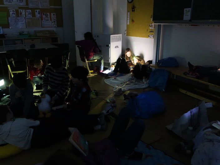 Kinder brachten Kissen, Kuscheltiere, Lese-Lampen und natürlich ein eigenes Buch mit. Zuerst gabe es eine Lese-Zeit oder Vorlese-Zeit in den Klassen. Als erstes kamen dann die Klassen 1 und 2 ins Forum. Dort wurden unsere Lese-Woche-Lieder gesungen wie „Lesen heißt auf Wolken liegen“. Zudem gab es auch ein eingesprochenes Vorlesebuch zum Hören und Sehen. Danach kamen die Kinder Klassen 3 und 4 ins Forum. Nach der Forumszeit gab es noch ein nettes Zusammensein in den Klassen mit den Eltern.