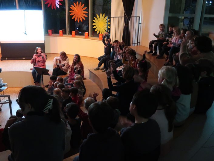 Kinder brachten Kissen, Kuscheltiere, Lese-Lampen und natürlich ein eigenes Buch mit. Zuerst gabe es eine Lese-Zeit oder Vorlese-Zeit in den Klassen. Als erstes kamen dann die Klassen 1 und 2 ins Forum. Dort wurden unsere Lese-Woche-Lieder gesungen wie „Lesen heißt auf Wolken liegen“. Zudem gab es auch ein eingesprochenes Vorlesebuch zum Hören und Sehen. Danach kamen die Kinder Klassen 3 und 4 ins Forum. Nach der Forumszeit gab es noch ein nettes Zusammensein in den Klassen mit den Eltern.