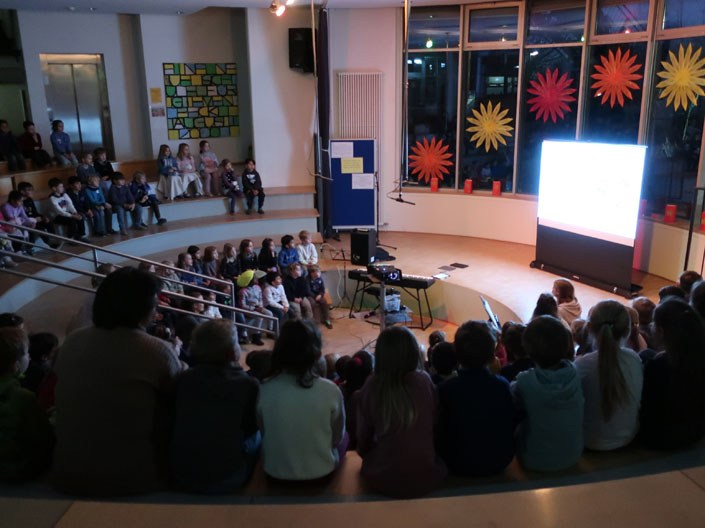 Kinder brachten Kissen, Kuscheltiere, Lese-Lampen und natürlich ein eigenes Buch mit. Zuerst gabe es eine Lese-Zeit oder Vorlese-Zeit in den Klassen. Als erstes kamen dann die Klassen 1 und 2 ins Forum. Dort wurden unsere Lese-Woche-Lieder gesungen wie „Lesen heißt auf Wolken liegen“. Zudem gab es auch ein eingesprochenes Vorlesebuch zum Hören und Sehen. Danach kamen die Kinder Klassen 3 und 4 ins Forum. Nach der Forumszeit gab es noch ein nettes Zusammensein in den Klassen mit den Eltern.