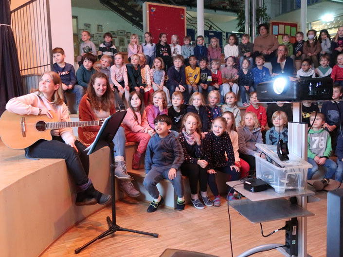 Kinder brachten Kissen, Kuscheltiere, Lese-Lampen und natürlich ein eigenes Buch mit. Zuerst gabe es eine Lese-Zeit oder Vorlese-Zeit in den Klassen. Als erstes kamen dann die Klassen 1 und 2 ins Forum. Dort wurden unsere Lese-Woche-Lieder gesungen wie „Lesen heißt auf Wolken liegen“. Zudem gab es auch ein eingesprochenes Vorlesebuch zum Hören und Sehen. Danach kamen die Kinder Klassen 3 und 4 ins Forum. Nach der Forumszeit gab es noch ein nettes Zusammensein in den Klassen mit den Eltern.