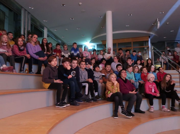 Kinder brachten Kissen, Kuscheltiere, Lese-Lampen und natürlich ein eigenes Buch mit. Zuerst gabe es eine Lese-Zeit oder Vorlese-Zeit in den Klassen. Als erstes kamen dann die Klassen 1 und 2 ins Forum. Dort wurden unsere Lese-Woche-Lieder gesungen wie „Lesen heißt auf Wolken liegen“. Zudem gab es auch ein eingesprochenes Vorlesebuch zum Hören und Sehen. Danach kamen die Kinder Klassen 3 und 4 ins Forum. Nach der Forumszeit gab es noch ein nettes Zusammensein in den Klassen mit den Eltern.