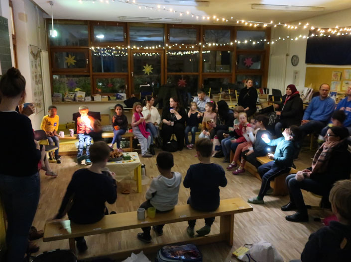 Kinder brachten Kissen, Kuscheltiere, Lese-Lampen und natürlich ein eigenes Buch mit. Zuerst gabe es eine Lese-Zeit oder Vorlese-Zeit in den Klassen. Als erstes kamen dann die Klassen 1 und 2 ins Forum. Dort wurden unsere Lese-Woche-Lieder gesungen wie „Lesen heißt auf Wolken liegen“. Zudem gab es auch ein eingesprochenes Vorlesebuch zum Hören und Sehen. Danach kamen die Kinder Klassen 3 und 4 ins Forum. Nach der Forumszeit gab es noch ein nettes Zusammensein in den Klassen mit den Eltern.