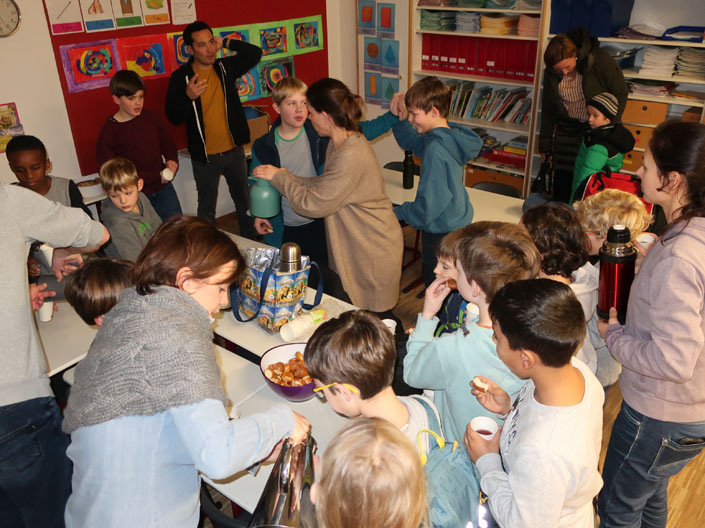 Kinder brachten Kissen, Kuscheltiere, Lese-Lampen und natürlich ein eigenes Buch mit. Zuerst gabe es eine Lese-Zeit oder Vorlese-Zeit in den Klassen. Als erstes kamen dann die Klassen 1 und 2 ins Forum. Dort wurden unsere Lese-Woche-Lieder gesungen wie „Lesen heißt auf Wolken liegen“. Zudem gab es auch ein eingesprochenes Vorlesebuch zum Hören und Sehen. Danach kamen die Kinder Klassen 3 und 4 ins Forum. Nach der Forumszeit gab es noch ein nettes Zusammensein in den Klassen mit den Eltern.