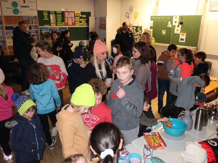 Kinder brachten Kissen, Kuscheltiere, Lese-Lampen und natürlich ein eigenes Buch mit. Zuerst gabe es eine Lese-Zeit oder Vorlese-Zeit in den Klassen. Als erstes kamen dann die Klassen 1 und 2 ins Forum. Dort wurden unsere Lese-Woche-Lieder gesungen wie „Lesen heißt auf Wolken liegen“. Zudem gab es auch ein eingesprochenes Vorlesebuch zum Hören und Sehen. Danach kamen die Kinder Klassen 3 und 4 ins Forum. Nach der Forumszeit gab es noch ein nettes Zusammensein in den Klassen mit den Eltern.