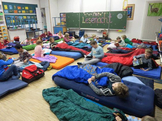 Donnerstag, den 21.01.2016, fand unsere Lesenacht statt. Dafür kommen alle Mosaik-Kinder und LehrerInnen um 19:30 zurück zur Schule, um gemeinsam in der Schule zu übernachten. Neben dem (Vor)Lesen, gab es auch ein Vorführung einer Gruppe aus der Lese-Woche sowie eine Nachtwanderung, die in der Turnahlle endete.