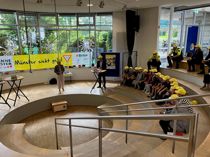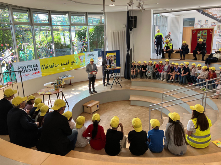 Zum Schulstart startet seit vielen Jahren auch die Aktion „Münster sieht gelb“. In diesem Jahr war die Auftaktveranstaltung am 09.08.23 im Forum der Mosaik-Schule, u.a. mit dem Oberbürgermeister Markus Lewe sowie der Polizeipräsidentin Alexandra Dorndorf.