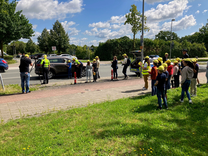 Der wichtigste Teil war natürlich das Verteilen der „Denk- und Dankzettel“ an der Dieckmannstraße. Diese Zettel hatten die Viertklässler bereits vor den Sommerferien gestaltet. Verteilt wurden sie nun durch die Klasse 4 Nie. Dafür haben Polizisten die Geschwindigkeit gemessen und dann Autos angehalten. Danke-Zettel gab es für die richtige Geschwindigkeit, Denk-Zettel als Erinnerung für zu schnelles Fahren.
