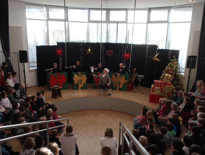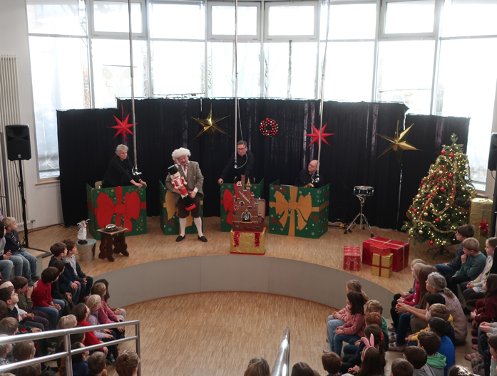 Am Freitag, den 10.01.25, versammelten wir uns alle bereits um 10:15 Uhr im Forum, denn zu Besuch waren das Saxophon-Quartett „Pindakaas“ und der Schaupspieler Frank Dukowski. Sie führten das Wintermärchen „Nussknacker und Mausekönig“ auf.