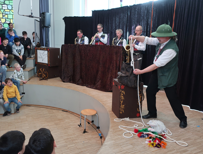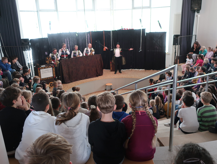 Am 18.04.24 war das Pindakaas Saxophon Quartett mit dem Stück „Die zauberhafte Welt des Herrn Alexander“ in der Mosaik-Schule. Mit dabei war auch der Schauspieler Frank Dukowski, der den ‚Zauberer Alexander‘ spielte. Und diese Person lebte tatsächlich im 19. Jahrhundert in Münster. Er soll der berühmteste Magier seiner Zeit gewesen sein. Zusammen wurden wir auf eine abwechslungsreiche Zeitreise genommen, um Stationen des Lebens des Herrn Alexander mitzuerleben.