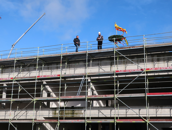 Der Polier und der Zimmermann tragen den Richt-Spruch vor.