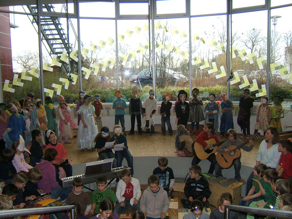 • im Schulforum mit Elementen wie: Singen, Musizieren, Feiern der Geburtstagskinder der Woche, Ehrung besonderer Leistungen (z.B. Seepferdchen, Lesekinder, Gedichtvortrag, Darbietungen der  Klassen bzw. Lerngruppen, Helferkinder).