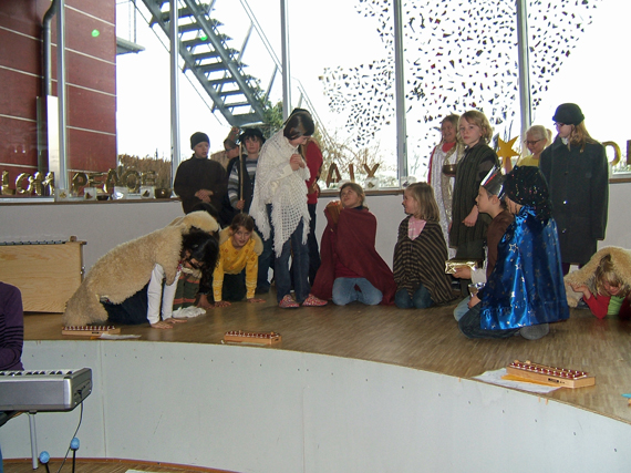 • im Schulforum mit Elementen wie: Singen, Musizieren, Feiern der Geburtstagskinder der Woche, Ehrung besonderer Leistungen (z.B. Seepferdchen, Lesekinder, Gedichtvortrag, Darbietungen der  Klassen bzw. Lerngruppen, Helferkinder).